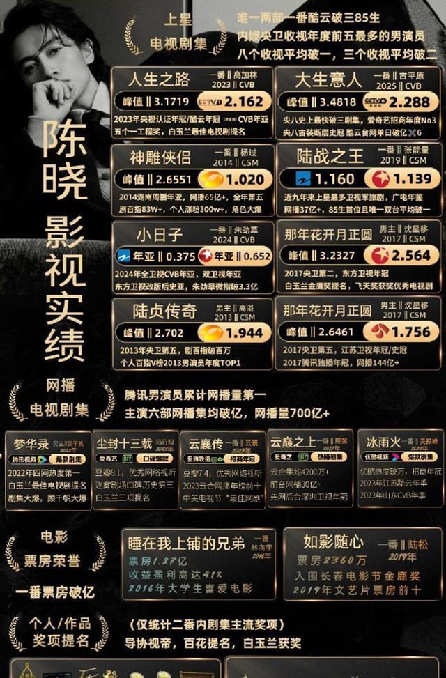 除了数据喜人之外,陈晓还获得了很多专业奖项的褒奖,收获了很多导演大会的年度男演员,还提名过百花奖、华鼎奖。