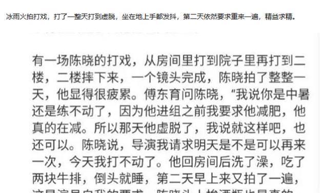 陈晓的付出,不但获得了观众的认可,更是业内人士口中的劳模,《冰雨火》的导演傅东育对陈晓拍戏过程中,拍到虚脱,还要坚持重拍的执着精神震撼到。