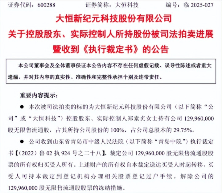 一位不知名女富豪李荣荣,豪掷3.62亿拍下同样不知名女性郑素贞,名下大恒科技公司6.29%的股权,成为该公司第一大股东。